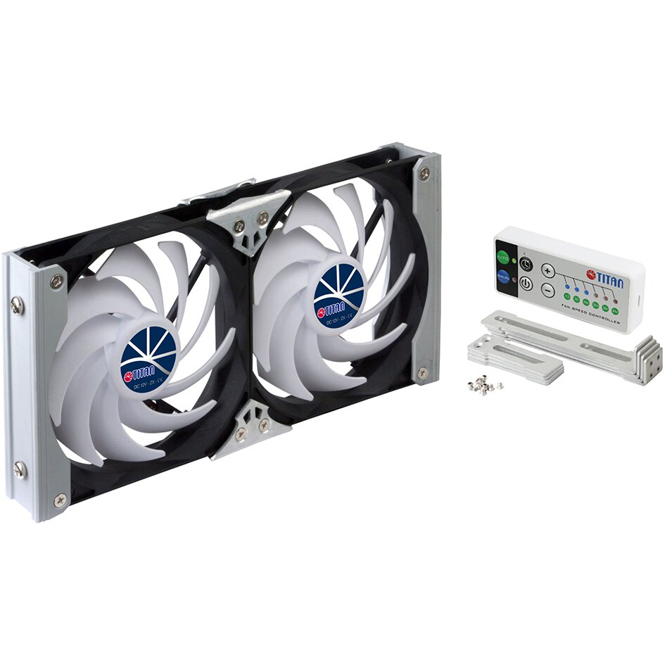 Den 12 volt dubbla fläkten är utrustad med en funktionell rackmonteringssats och en smart extern styrenhet. Denna gör att hastigheten kan anpassas till behoven på två sätt: å ena sidan via en manuell 6-stegsinställning och å andra sidan via en termostat som automatiskt som stänger av vid 20 ° C och vid 45 ° C ger maximal hastighet. Den integrerade timern gör det möjligt att ställa in 6 olika starttider. Trots den starka extra kyleffekten arbetar den här dubbla fläkten mycket tyst.