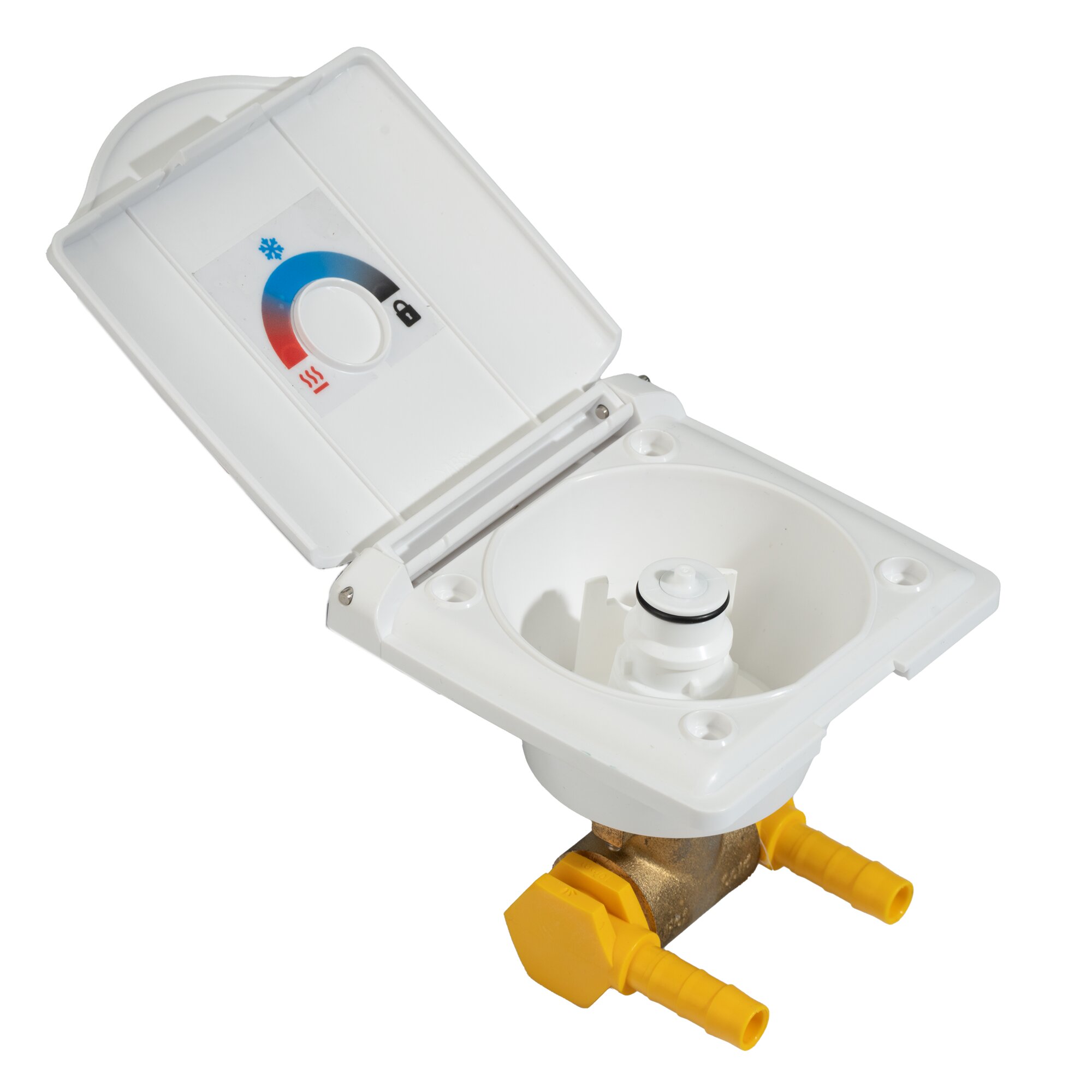 Produktbeskrivning Upptäck denna högkvalitativa utomhusduschkoppling för varmt och kallt vatten. Med en enkel vridning av kopplingen kan du enkelt reglera vattentemperaturen. Kopplingen har ett praktiskt lock som låses på plats i både öppet och stängt läge. Du drar också nytta av förmonterade kopplingsmunstycken som möjliggör snabb och enkel installation. Denna robusta och hållbara duschkoppling är den perfekta lösningen för campare och friluftsentusiaster.