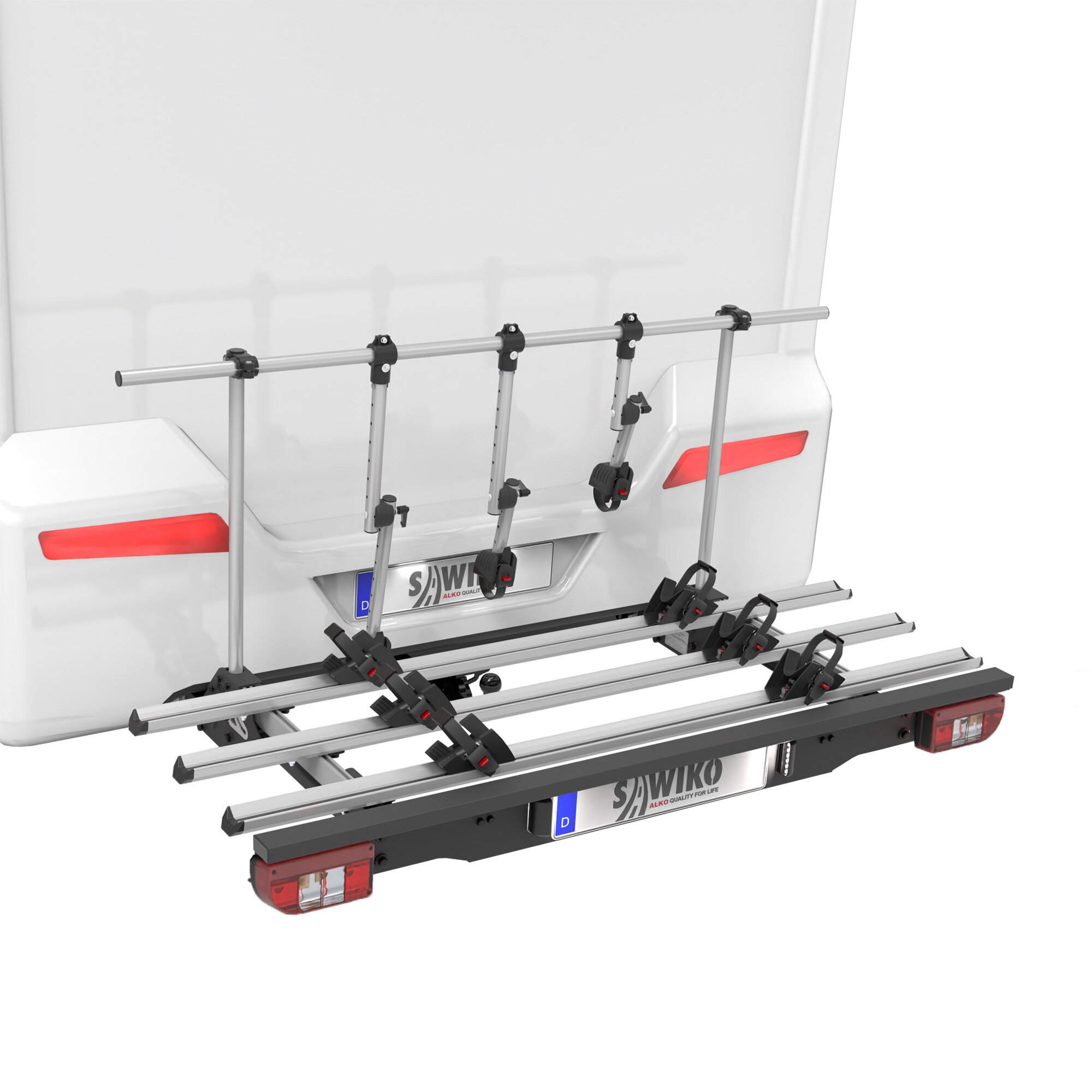 Det moderna cykelstället finns nu även med en LED-ljusramp, och du kan välja mellan LED- och konventionell belysning. Den har en lättviktsdesign som ändå garanterar hög stabilitet. Med en maximal nyttolast på 80 kg är den idealisk för säker transport av upp till 3 cyklar eller elcyklar. Velo erbjuder också större bekvämlighet tack vare sin användarvänlighet: transportplattformen fälls ihop utan ansträngning när den inte används, vilket sparar utrymme. Tack vare den nya fällmekanismen med en spak fälls även ljusrampen ihop automatiskt. Cykelskenorna och stödarmarna med spärrhakefästen säkerställer ett säkert grepp för cyklarna, och ett ombyggnadskit för elcyklar ingår.